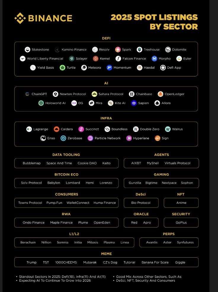 In 2025, Binance facilitated the listing of 87 projects spanning 16 distinct sectors.