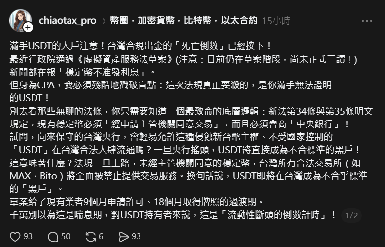 This provision explicitly outlines a mechanism for offshore stablecoins, not issued in Taiwan, to gain approval for trading within the country. The anonymous Threads user’s fundamental logical flaw was the baseless presumption that the Central Bank would automatically reject all foreign stablecoins post-legislation, presenting this speculative assumption as an established fact to incite panic.
