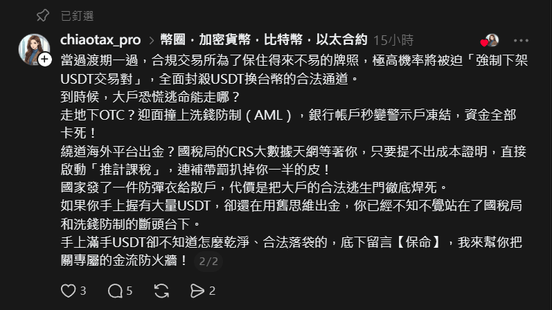 This incident is not isolated. A recurring pattern can be observed in recent social media posts designed to generate panic around cryptocurrency deposits and withdrawals in Taiwan. These posts often exhibit a distinct “AI-like” writing style and frequently conclude with explicit or implicit suggestions to seek alternative, often illicit, withdrawal channels. The typical structure of such misleading posts includes: