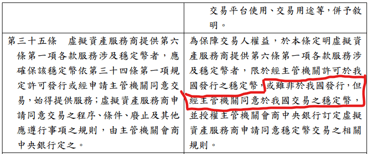 “Virtual asset service providers offering services involving stablecoins are limited to stablecoins approved by the competent authority for issuance in Taiwan, or stablecoins not issued in Taiwan but approved by the competent authority for trading in Taiwan.”