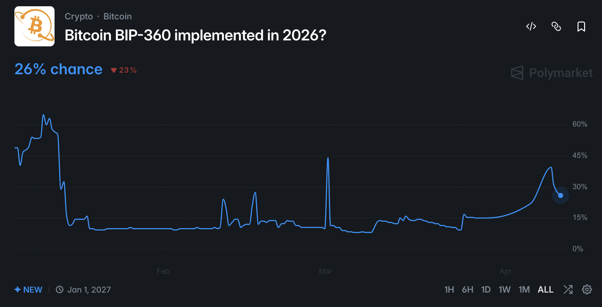 On the prediction platform Polymarket, traders currently assess the probability of a Bitcoin quantum-resistant upgrade proposal (such as BIP-360) being adopted by 2027 at approximately 26%. While academic discourse continues regarding the precise timing of large-scale quantum attacks, the recent emergence of these rescue tools and transaction proposals significantly bolsters the network’s resilience against future risks.