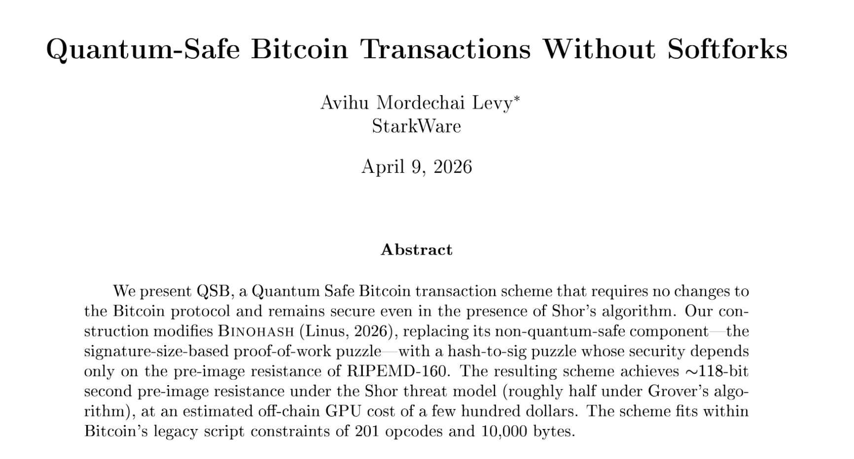 Concurrently, on the same day (April 9th), StarkWare developer Avihu Levy introduced groundbreaking research titled “Quantum Safe Bitcoin” (QSB). This proposal presents a method for achieving quantum-resistant transactions without necessitating any modifications to Bitcoin’s core consensus rules or requiring a soft fork.