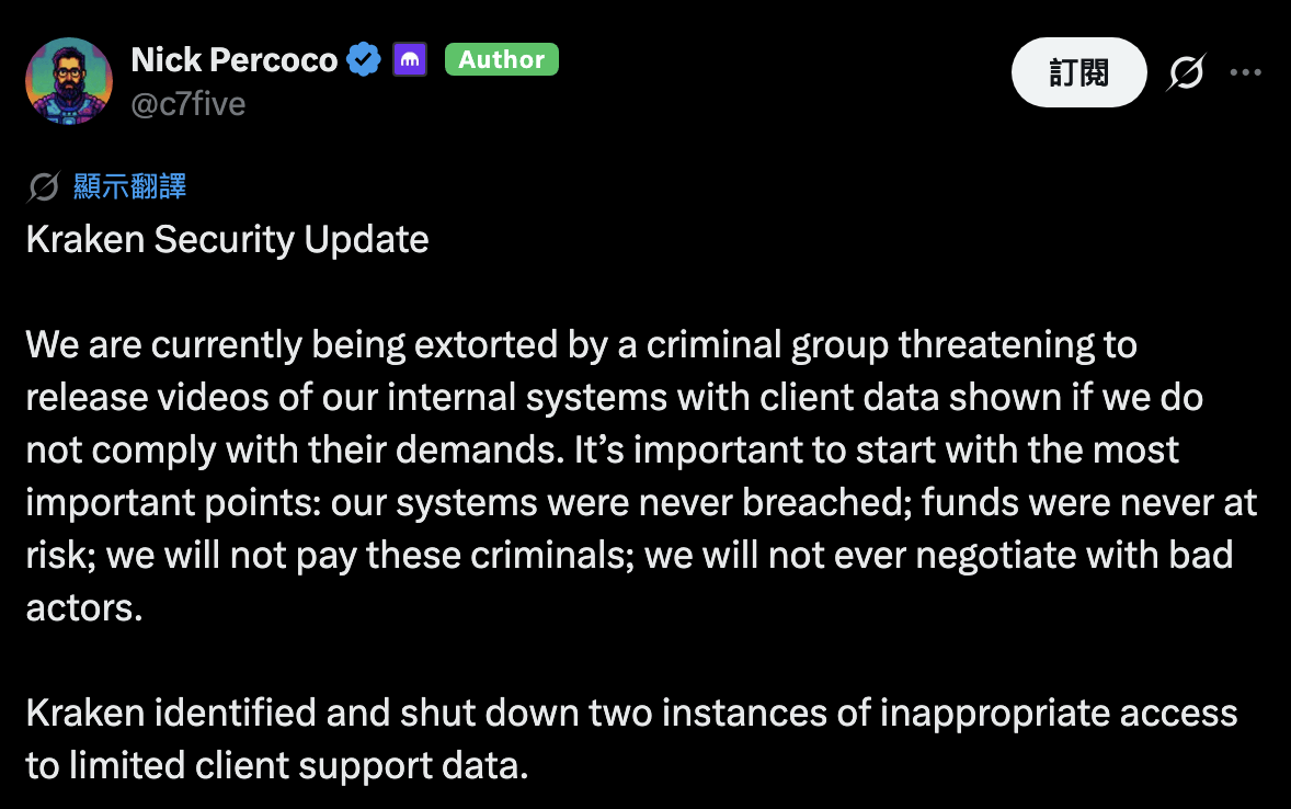 Image source: X/@c7five | Kraken CSO Nick Percoco confirms the company is being extorted by a criminal organization.
