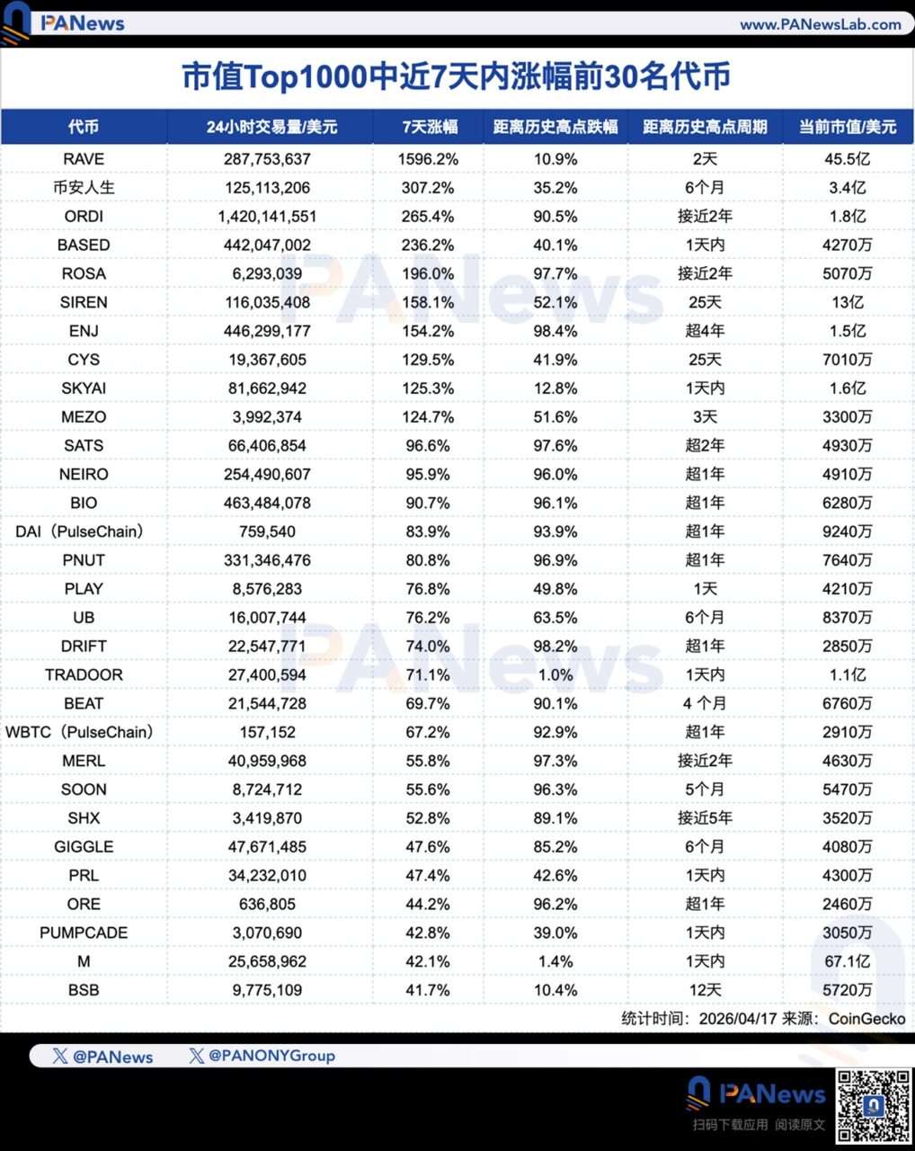 However, a closer examination reveals a stark disparity. The top 10 tokens alone saw gains exceeding 100%, with standouts like RAVE, Binance Life, and ORDI soaring by 1596.2%, 307.2%, and 265.4% respectively. The remaining 20 tokens, while positive, showed more modest growth, averaging around 65.6% within the 40-100% range. This clearly demonstrates that a few exceptional assets disproportionately influenced the overall market performance.