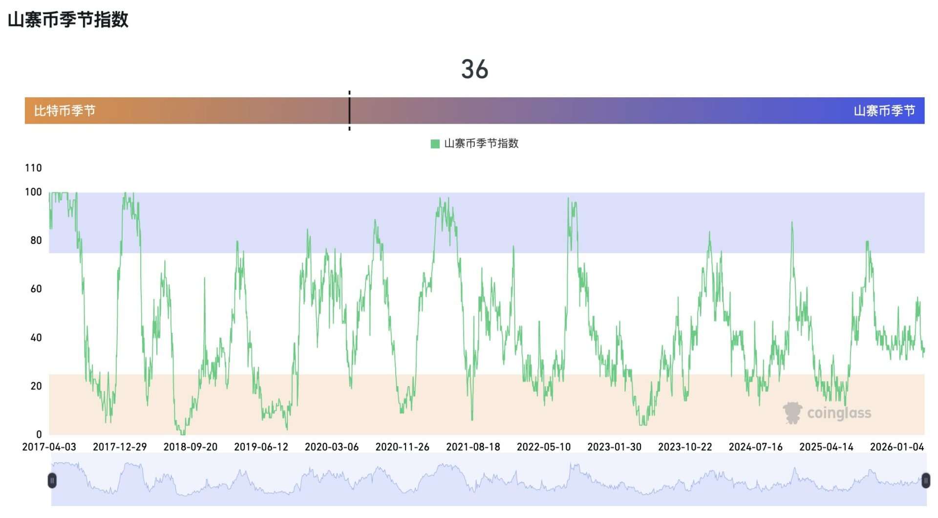 The CoinGlass Altcoin Season Index currently stands at 36, indicating that the market has not entered a broad “altcoin season.” The vast majority of tokens continue to underperform Bitcoin, with capital predominantly flowing into a select few strong assets.