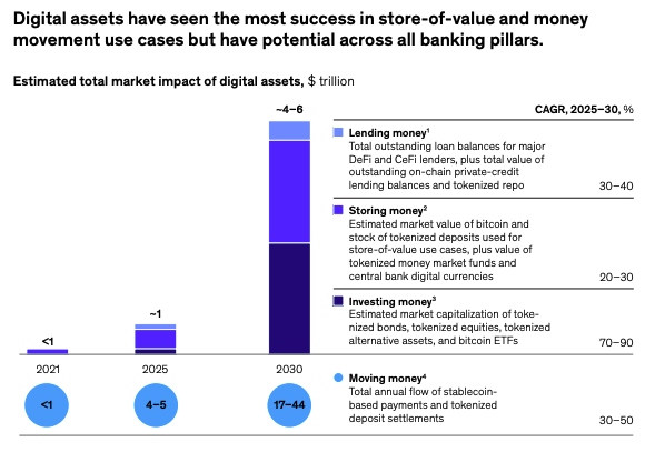 After a decade of experimentation, digital assets are shedding their speculative image and evolving into investable infrastructure for mainstream financial institutions. The period of irrational exuberance from 2020-2022 has concluded, shifting market focus towards stablecoins and tokenized deposits. These innovations are poised to fundamentally transform money transfer, storage, lending, and investment, with all segments anticipating high double-digit growth by 2030.