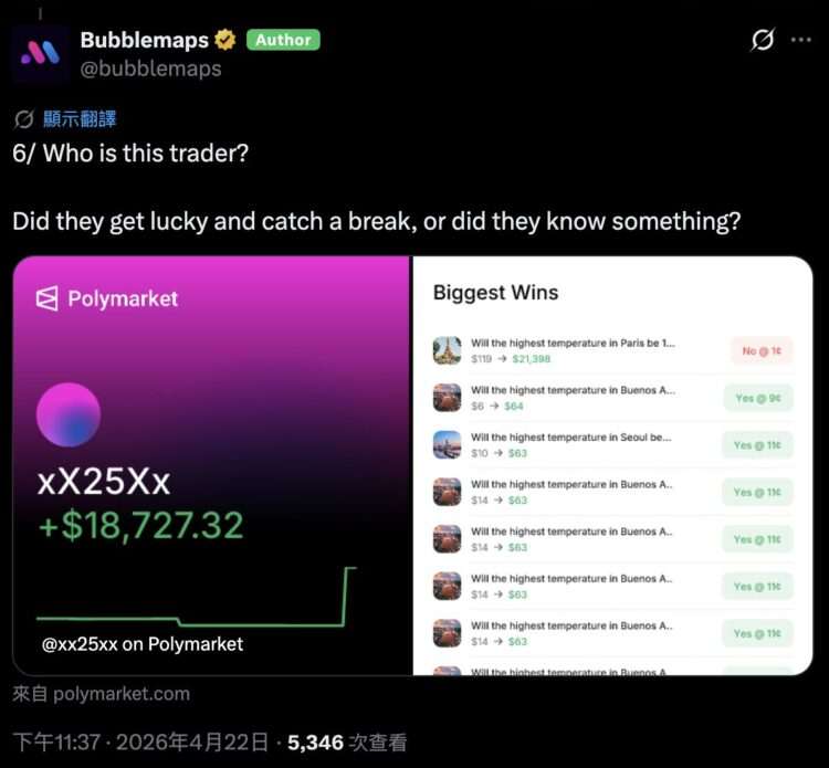 Blockchain analytics firm Bubblemaps highlighted a particularly suspicious transaction. Minutes before the abnormal data appeared on April 15, a long-standing participant in climate prediction markets placed a substantial $120 wager, predicting the day’s maximum temperature would exceed 18°C. At the time, the probability of this outcome was less than 1%. However, as the sensor data mysteriously soared, the trader cashed in a significant payout.